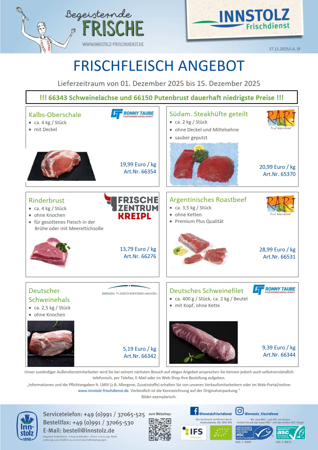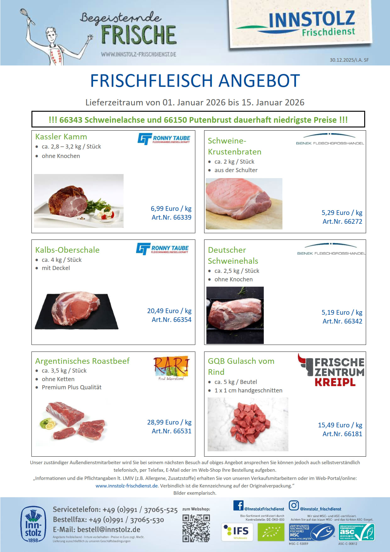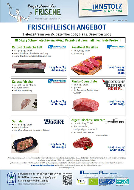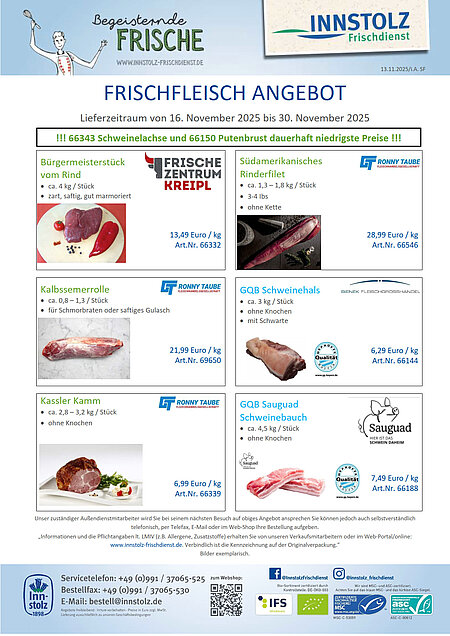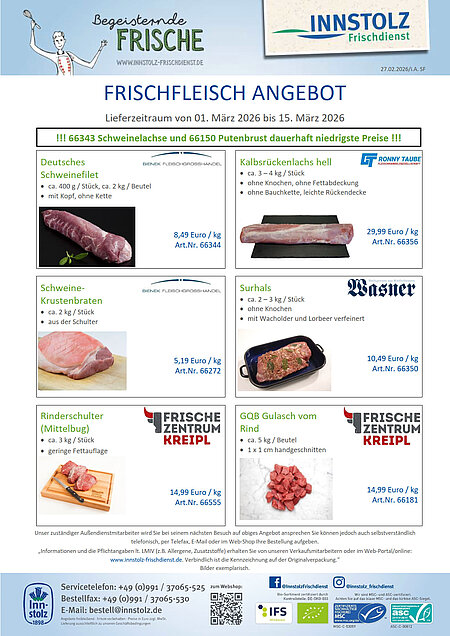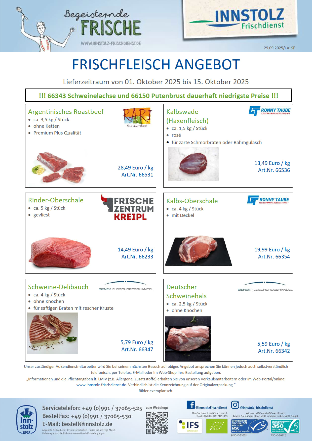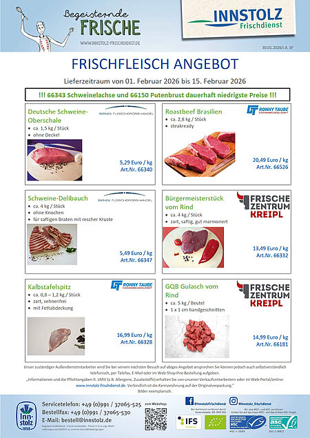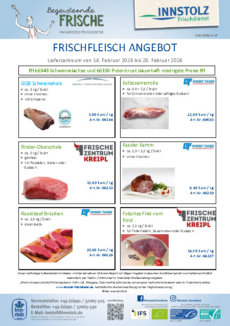 Hier finden Sie unser aktuelles Frischfleischangebot als pdf-Datei zum Downloaden. Bitte haben Sie Verständnis dafür, dass Sie die Preise nur als registrierter Nutzer einsehen können. Für weitere Infos dazu benützen Sie bitte unser Kontaktformular. Alle Angebote solange der Vorrat reicht. Irrtümer und Druckfehler vorbehalten.