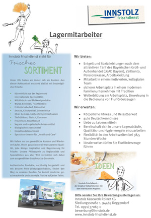- Außerdem sollten Sie nicht kälteempfindlich sein (warme Arbeitskleidung wird gestellt). Kühllager (+4 °C) und Tiefkühlhaus (-18 °C)