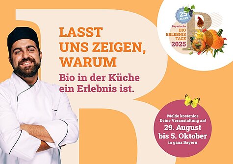 Für eine Teilnahme bei den Bio-Erlebnistagen brauchen Sie als Gastronomie-Betrieb eine Zertifizierung nach der Bio-AHVV. Außerdem gilt: Am Aktionstag muss mindestens ein angebotenes Gericht zu 100% aus Bio-Zutaten bestehen. Sonst sind Ihrer Fantasie keine Grenzen gesetzt.