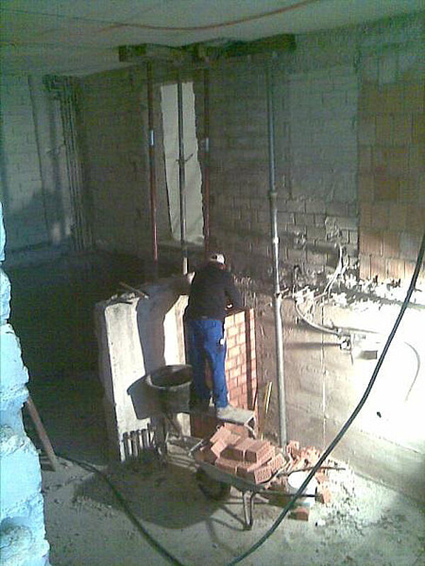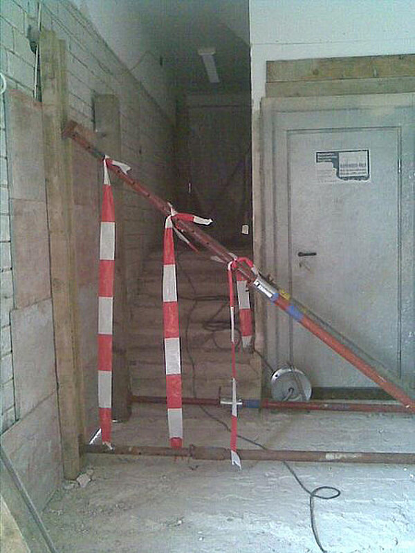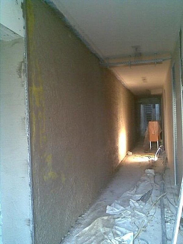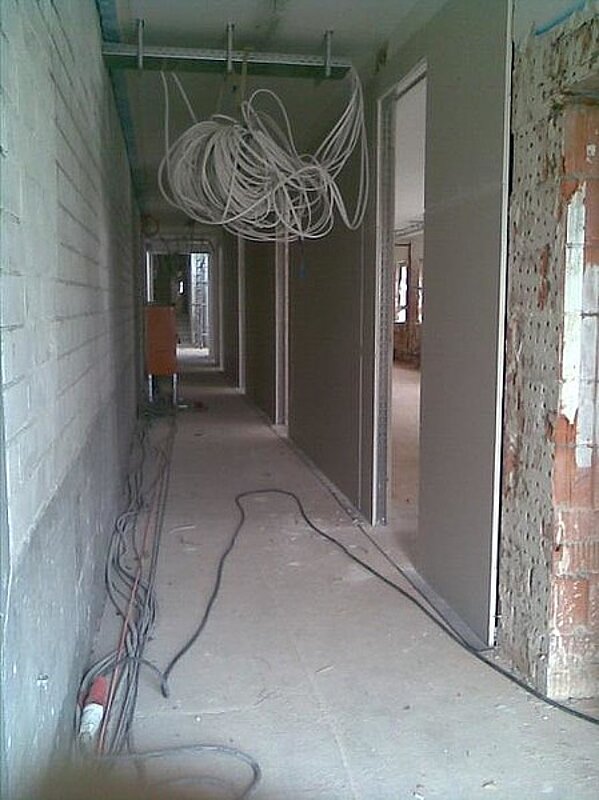 Nach 4 Monaten Trocknungsarbeiten, Putz entfernen und vielem mehr entschieden die Gutachter, nach durchgeführten Bohrungen und bauphysikalischen Untersuchungen, das zahlreiche Betondecken, Außen- und Innenmauern im Büro- und Sozialräume-Trakt entfernt und neu errichtet werden müssen.