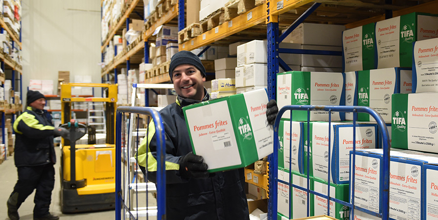 Alle am Vortag der geplanten Liefertour erteilten Bestellungen nehmen unsere Kunden am Folgetag entgegen. Rund 11.000 verschiedene Lebensmittel gelangen so über unsere zertifizierten Kühlzonenlager in die Feinverteilung – direkt in die Küche, in die Theke oder ins Regal.